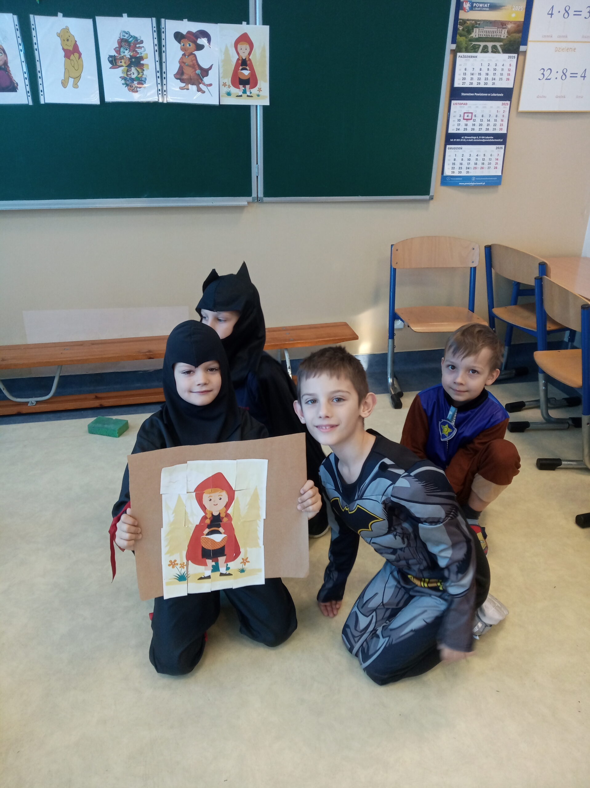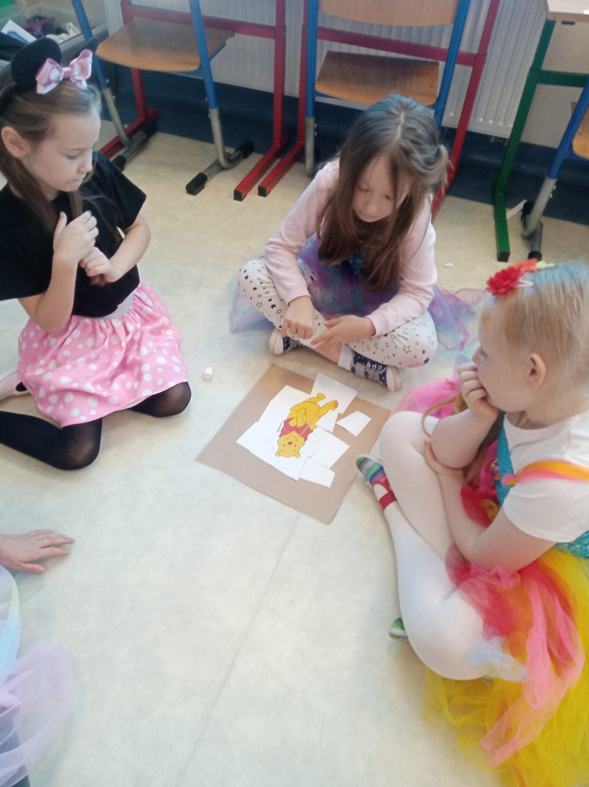 puzzle przedstawiające bohaterów bajek. Na zakończenie każda klasa pozowała